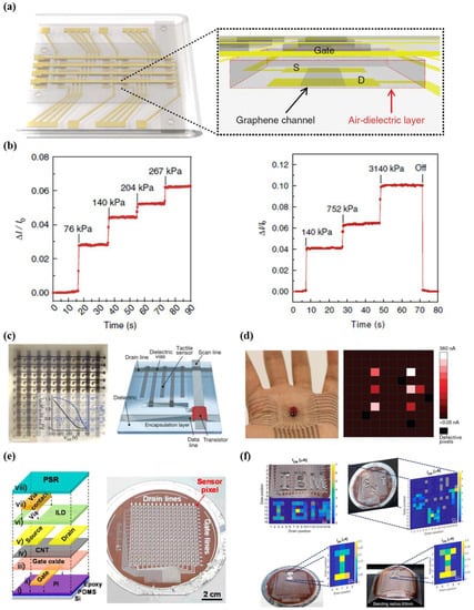 (a) Schematic illustration of pressure-sensitive graphene FETs (left). Cross-sectional image unit cell with a graphene channel and an air dielectric layer (right); (b) the characteristic of the air dielectric graphene transistors as a function of time at various pressure levels (left: maximum level of 267 kPa, right: maximum level of 3140 kPa) (reprinted with permission for Figure 5a,b from Ref. [52] under CC-BY 4.0 license); (c) image of intrinsically stretchable transistor and illustration of unit cell with tactile sensor, electrodes, dielectric, and passivation layer; (d) photograph showing the conformal transistor array with ladybug on palm (left), current mapping data resulting from the pressure of the six legs of a ladybug (right) (reprinted with permission for Figure 5c,d from Ref. [58] Copyright 2018 Springer Nature); (e) schematic illustration showing fabrication steps of a flexible pressure sensor (left), the photographic image of the active matrix tactile sensor with 16 × 16 array; (f) the current mapping data indicating pressure distribution at flat and bending states (radius of 60 mm) (reprinted with permission for Figure 5e,f from Ref. [50] Copyright 2018 American Chemical Society).