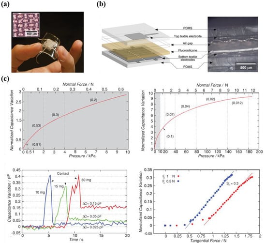 Viry et al. fabricated a highly flexible capacitive three-axial force sensor, which consists of conductive fabric electrodes with an intrinsic resistance of 50 mΩ/square, via rapid and economic fabrication strategies (Figure 6a) [68]. The developed sensor includes perpendicular groups of conductive yarns (warp and weft) and an elastomeric material (Figure 6b). Due to the air gaps in fluorosilicone, which was used to form a dielectric layer, the developed sensor possessed outstanding capabilities such as a minimum detection resolution of less than 10 mg and displacement of 8 μm. The introduced three-axial force sensor was measured to have an estimated detection range from 190 kPa to 400 kPa (Figure 6c,d). The researchers expect the developed high performance tactile sensor to be useful in various fields, including highly advanced robotics, wearable devices, biomedical systems, and touch panel systems for the gaming industry.