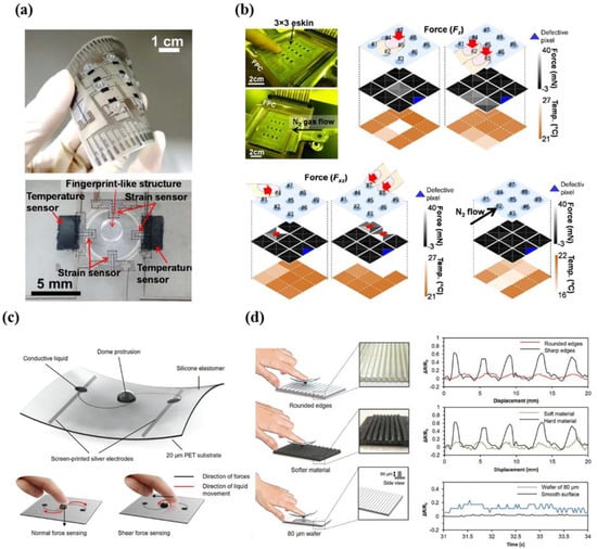 Harada et al. developed a strain-engineered three-axis tactile sensor (36 strain gauges) and a temperature sensor (nine cells) with a 3 × 3 array over an area of 8 × 8 cm2 to address issues in the measurement of tangential force, normal force, and temperature for e-skin applications (Figure 7a) [67]. The researchers proposed a practical and economic method that does not utilize vacuum deposition systems or metal photolithography for sensor fabrication and patterning, and instead uses a printing fabrication technique. Optimal structures that imitate fingerprints enable the simultaneous measurement of normal forces, shear forces, and temperature, as shown in Figure 7b. The results indicate that the developed fully printed flexible three-axial force sensor with temperature sensing components can be used in e-skin applications for the detection of multiple stimuli, despite having a lower spatial resolution and smaller size of the array compared to human skin.