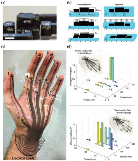 (a) Magnified image showing the structure of a unit cell; (b) schematic illustration showing the working mechanism; (c) photograph of e-skin that fully covers the area of a human hand; (d) changes in voltage under normal and shear loads (reprinted with permission for Figure 8a–d from Ref. [71] Copyright 2016 John Wiley and Sons).