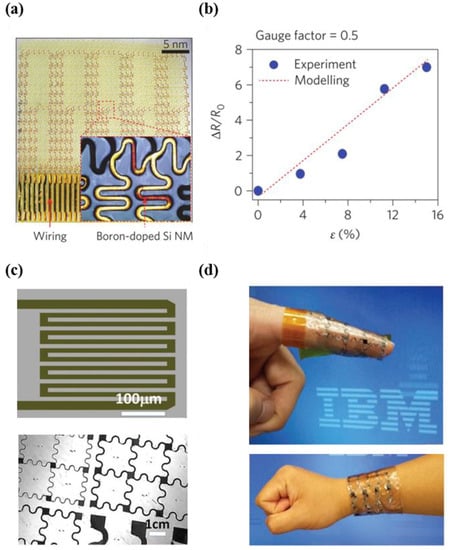 (a) Photographic image of silicon strain sensor and location of boron-doped silicon nanomembrane; (b) the relative change in resistance versus strain (%) with modeling data (reprinted with permission for Figure 9a,b from Ref. [11] Copyright 2014 Springer Nature); (c) image of strain gauge with the serpentine shape pattern and picture of device on tape without stress layer; (d) photographic image showing e-skin applications on the finger and wrist (reprinted with permission for Figure 9c,d from Ref. [77] Copyright 2017 John Wiley and Sons).