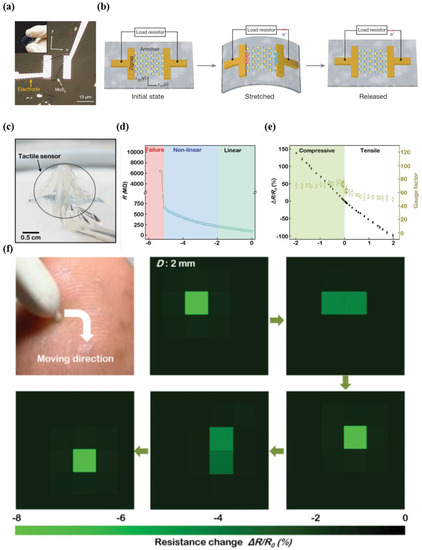 Basing on the exceptional characteristics of MoS2, Park et al. first demonstrated an ultrathin conformal, MoS2-based tactile sensor array with an area of 2.2 × 2.2 cm2 (Figure 11c) [18]. The tactile sensor was fabricated using a photolithographic patterning process, and the devices had a total thickness of less than 75 nm (1.4 nm of MoS2, 0.9 nm of graphene, 35 nm of SU-8 passivation layers, and 35 nm of SU-8 substrate). The unit cell of MoS2, which had an interdigitated structure (channel width of 37.9 mm and length of 0.05 mm), exhibited three regions: linear (below −1.98% strain), non-linear (from −5.23% strain to −1.98% strain), and failure modes (above −5.23% strain) (Figure 11d). As shown in Figure 11e, the gauge factors were measured as −72.5 ± 1.9 and −56.5 ± 4.8 for compressive strain and tensile strain, respectively. The pressure distributions were recorded in real time when pressure was applied using a stylus pen on the tactile sensor array that was attached to a fingertip. The results in Figure 11f showed that measurements could be effectively conducted during the full e-skin demonstration under pressure, which guarantees the stable operation of e-skin under continuous stimuli of pressure without degradation of sensor performance. The beneficial features could lead to the development of tactile sensors that are capable of discerning multi-directional forces such as normal and shear forces.