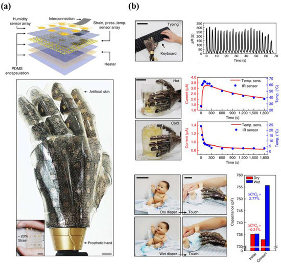 Kim et al. introduced a type of stretchable prosthetic skin based on ultrathin single crystalline silicon nanoribbons (SiNR) with strain, pressure, temperature, and humidity sensing capabilities to conduct measurements of external environments, in addition to heating capabilities (Figure 12a) [139]. The researchers adopted strategies for stretchability by using serpentine metal lines and ultrathin layouts for neutral mechanical planes in the SiNR sensor array. This provides good spatio-temporal sensitivity and reliability, as well as wide sensing ranges, which are key in the development of e-skin that mimics human skin. The developed e-skin exhibited outstanding performance in response to various daily life situations such as hand shaking, keyboard tapping, ball grasping, holding a cup of hot/cold liquid, detection of dampness resulting from fluid contact, and contact with humans (Figure 12b).