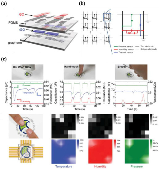 Ho et al. introduced an all-graphene multi-functional e-skin sensor matrix that was fabricated via a simple lamination process, comprising of graphene oxide (GO)-based impedance humidity sensors, reduced graphene oxide (rGO)-based resistive thermal sensors, and PDMS-based capacitive pressure sensors (Figure 14a,b) [138]. The developed all-graphene e-skin possessed various features such as high optical transparency, good sensitivity, and multimodality to simultaneously differentiate target signals from each sensor. The outputs of the three different types of stimuli, which were hot wind blowing, hand touching, and breathing, show that the responses of the multi-functional e-skin developed in this research was successfully collected (Figure 14c).