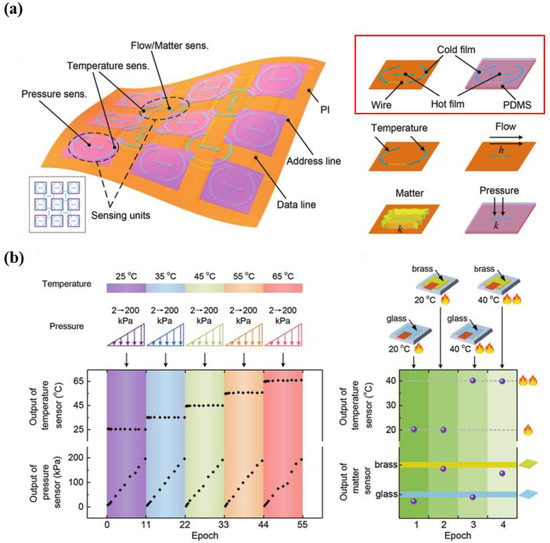 Zhao et al. developed thermosensation-based artificial skin with multiple sensing capabilities, including the detection of pressure, air flow, matter, and temperature using platinum (Pt) as a sensing material (Figure 15a) [141]. An advantage of this multi-functional device is the simple structure obtained via a patterning process of Pt elements, which enables large-scale and low-cost fabrication. Other advantages include good stability over 7 h and high repeatability during a 2000 cyclic test. The device was subjected to pressures ranging from 2 kPa to 200 kPa under various temperatures ranging from 25 °C to 65 °C. Pressure was applied onto the device under two different temperature values (20 °C and 40 °C) using two different materials (glass and brass), as shown in Figure 15b. Consequently, the results of the multi-parametric e-skin showed simultaneous and selective sensing capabilities in the hybrid situations.