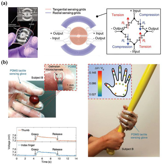 (a) Photograph of the microfluidic diaphragm pressure sensor (left). Illustration showing a layout of the sensing area including tangential and radial sensing components (middle). Circuit diagram of the device using a Wheatstone bridge (right); (b) Photographic image indicating the tactile sensing glove equipped with the device (top left). Plot showing real-time measurement during the motion of gripping a grape, by using thumb and index finger (bottom left). Photographic image showing the array sensing capabilities, when grasping a bat (right) (reprinted with permission for Figure 16a,b from Ref. [146] Copyright 2017 John Wiley and Sons).