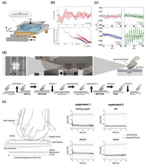 (a) Schematic illustration of the measurement setup (left); (b) plot of pressure variation according to the displacement (smooth and fingerprinted fingers) (top). Output data of power spectra of signals from Fourier transform (bottom) (reprinted with permission for Figure 18a,b from Ref. [156] Copyright 2009 The American Association for the Advancement of Science); (c) plot showing the fluctuations (tangential force) with respect to μ/λ (reprinted with permission for Figure 18c from Ref. [157] Copyright 2011 American Physical Society). (d) Schematic illustration showing experimental setup and flow by using sensorized finger (reprinted with permission for Figure 18d from Ref. [9] under CC-BY 4.0 license); (e) illustration of experimental setup and tools (left), measured force as a function of time at various texture (baking paper, silk, denim, and wood) (right) (reprinted with permission for Figure 18e from Ref. [160] under CC-BY 4.0 license).