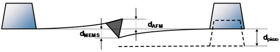 Assuming that once the equilibrium has been reached, the forces acting on the AFM probe and the sensor under test are the same. Thus, it can be stated that , where and are the AFM and sensor deflections, respectively. Considering an AFM piezo vertical displacement during the measurement required to move the sample position, it is noticeable that combines both the AFM probe and MEMS sensor displacements, as shown in Figure 1. Thus, the resulting sensor displacement can be calculated as follows [6,7,8,9]: