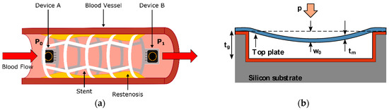 Building parts of a passive pressure sensing iStent. (a) Lateral view of the iStent implanted inside a blood vessel; (b) cross-sectional view of a MEMS capacitive pressure sensor.