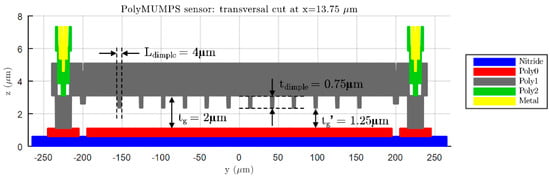 View of the transversal cut at for a PolyMUMPS squared sensor, based on a top bottom plate configuration with sides and , respectively.