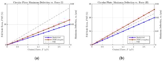 Maximum deflection versus central force for a fully clamped circular plate. (a) Analytical model and FE simple model results; (b) analytical model and FE complex model results.