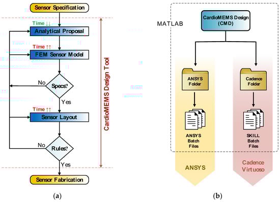 MEMS sensor design flow, as shown in Figure 9a, comprises three main stages. First, a rough sensor design proposal is obtained by the evaluation of a set of analytical expressions, while satisfying the initial design constraints. Second, the sensor realistic 3D structure is implemented in a modelling software for FE analysis; in order to perform the necessary simulations to achieve an accurate characterization of the device behavior. Finally, the third stage involves the sensor layout description in the corresponding technology layers being sent to the manufacturer. CardioMEMS Design (CMD) is a Matlab-based computer aided design (CAD) tool developed with the aim of automating the aforementioned design steps, as well as providing a friendly interface to guide the user through the sensor design process [14,15]. Thus, as exposed in Figure 9b, CMD provides as outputs the set of files required to export the designed sensor to ANSYS and Cadence Virtuoso working environments, to perform different FE analyses and build the sensor layer description, respectively.