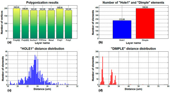 Sensor statistics provided by CMD, including (a) number of vertices for each fabrication technology layer; (b) number of “hole” and “dimple” elements included in the sensor structure; (c) distance distribution between “hole” elements; and (d) distance distribution between “dimple” elements.