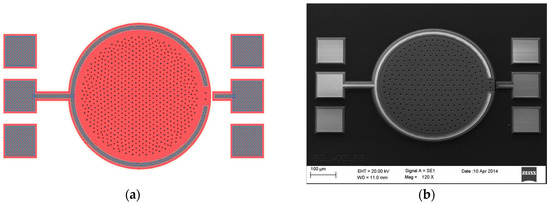 Final design stages for a circular MEMS pressure sensor with top plate radius of . (a) Cadence Virtuoso layout view, generated through the SKILL batch files provided by CMD; (b) scanning Electron Microscope (SEM) picture of the fabricated sensor.