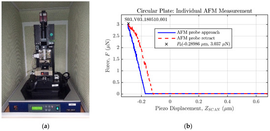 The microscope mounts a probe PPP-NCHR with a spring constant of nominal value , and a tolerance range of , as specified by the manufacturer. The AFM has been configured to apply a maximum force of to the sensor plate, in order to obtain a force () against piezo displacement () curve similar to the one displayed in Figure 14b. Both sensors have been measured a total of 20 times, and during each individual measurement, the piezo displacement is varied in 4096 steps; so the resulting data set can be considered statistically significant.