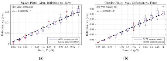 Figure 15a,b include the whole set of AFM measurements carried out for the square and circular sensors experimental characterization, respectively. Both graphs present the statistical data of sensor deflection for each applied force, displaying its average value, the 25th and 75th percentiles, and the extreme collected values. With this information, a least-squares fitting procedure has been applied to obtain a linear approximation for the aforementioned data, probing the maximum deflection to be proportional to the applied force as predicted by analytical and FE simulation.