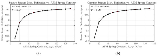 However, the experimental measurements bring out a higher sensor sensitivity than expected from both FE and analytical models. This result can be explained if the impact of the spring constant value is quantified, as done in Figure 16. These two graphs show how the selection of a spring constant value for the probe significantly affects the final result for the maximum deflection of both square and circular geometries of the sensor. As an example, the tolerance range set by the manufacturer goes from 10 to 130 N/m, but values below 25 N/m would lead to unreasonable negative deflection results.