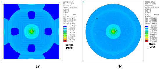 ANSYS results for the sensor stress distribution in MPa under an applied concentrated force of at the top plate center. (a) Square sensor stress distribution; (b) circular sensor stress distribution.