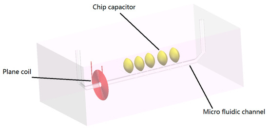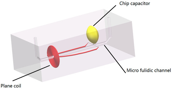 The micro fluidic resonant oil detection chip is designed to detect the metal debris in oil based on electromagnetic theory as shown in Figure 1. The chip is composited of a plane coil, a chip capacitor, and a micro fluidic channel.