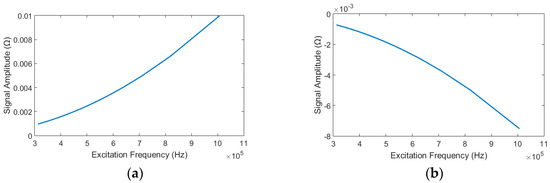 Figure 5. The relationship between excitation frequency and impedance signal amplitude value: (a) impedance signal value produced by ferromagnetic particle and (b) impedance signal value produced by non-ferromagnetic metal particle.