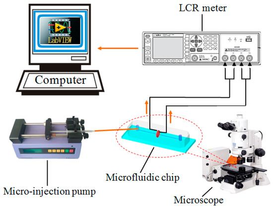 The impedance detection system is shown in Figure 6. It consists of a micro-injection pump (Harvard Apparatus B-85259, Harvard Apparatus, Holliston, MA, USA), a microscope (Nikon AZ100, Nikon, Tokyo, Japan), a micro fluidic chip, an inductance (L), capacitance (C), and resistance (R) meter (Agilent E4980A, Agilent Technologies Inc., Bayan Lepas, Malaysia) and a computer with LabVIEW software (LabVIEW 2011, National Instruments, Austin, TX, USA).