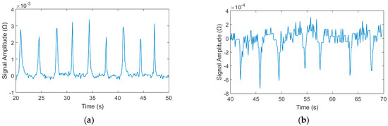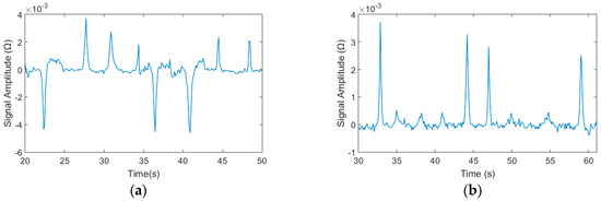 Figure 8. Detection results of iron and copper particles, the excitation voltage was 2 V and the excitation frequency was 0.9 MHz: (a) iron particles with sizes ranging from 70–80 μm and (b) copper particles with sizes ranging from 140–150 μm.