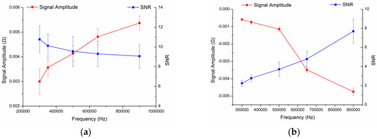 Figure 9. Influence of particle amplitude and signal-to-noise ratio (SNR) with excitation frequency: (a) 70–80 μm Iron particles detection results, the blue line was SNR, and the red line was signal amplitude and (b) 140–150 μm copper particles detection results, the blue line was SNR, and the red line was signal amplitude.
