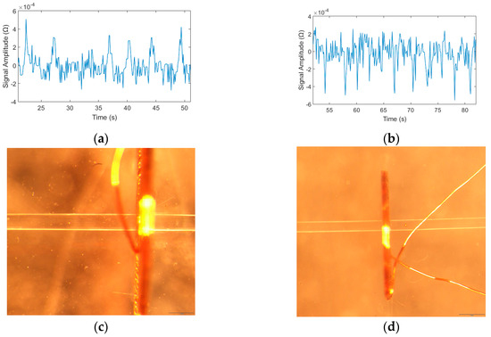 Figure 10. The limitation detection results of iron and copper particles, the excitation voltage was 2 V and the excitation frequency was 0.9 MHz: (a) iron particles with sizes ranging from 20–30 μm; (b) copper particles with sizes ranging from 70–80 μm; (c) 20–30 μm iron particle under microscope; and (d) 70–80 μm copper particle under microscope.