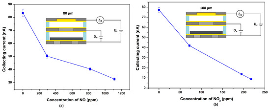 Simultaneous detection of NO and NO2 in a gas mixture using a sensor array with 80 μm and 100 μm separations at 150 V Ue and 10 V Uc, respectively. The collecting currents decreased with increasing (a) NO and (b) NO2 concentrations in dry air.
