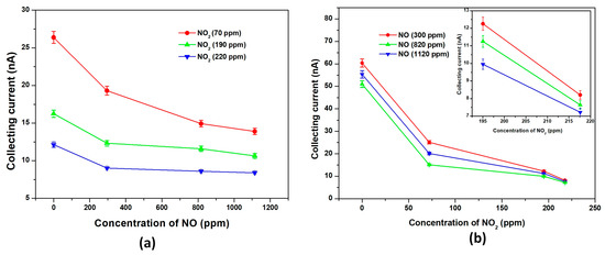 Cross-sensitivity is a key problem in the practical application of gas selective detecting. Figure 4a,b show the response of each sensor in the array to the mixture of NO and NO2, respectively. The collecting current was reduced dramatically from 19.31 nA to 9.02 nA to 300 ppm NO with the NO2 concentration increasing from 70 ppm to 220 ppm (Figure 4a). The average variation of the collecting current for each NO concentration was about 10 nA and as high as half of its response. In other words, the CNTs-based ionization sensor with 80 µm separations could detect the concentration of NO very well no matter how the NO2 concentration in the gas mixture changed. While for NO2, the minimum variation in the collecting current was also nearly 400 pA and occurred at 220 ppm when the concentration of NO in the gas mixture changed (Figure 4b). Accordingly, the ionization sensor with 100 µm separations still had the ability to detect NO2 accurately in the gas mixture even though the effect of the NO concentration on the NO2 response was weaker (insert in Figure 4b).