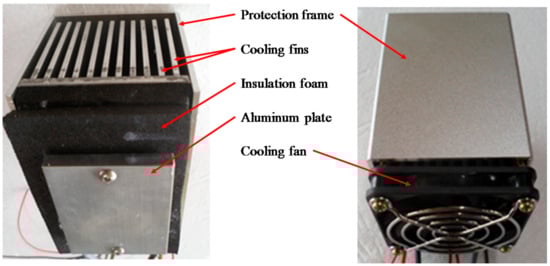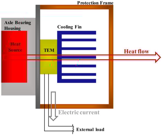 A TEHS consists of a TEM and a cooling system. As shown in Figure 1, one side of the TEM is attached to an axle bearing housing as the heat source, generating power by thermoelectric effect. A cooling system attached to the other side of the TEM improves the power-generating amount by increasing the temperature gradient on both sides of the TEM through effective cooling progress. In addition, the cooling system acts to protect the TEM from impact from external substances as the rolling stock runs fast and also serves as an installation frame fixing the system on the housing.