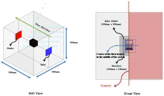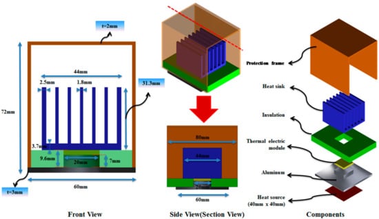 In this study, the heat flux due to the temperature difference between the axle bearing housing of the rolling stock and the outdoor air was converted into electric energy by using a TEM. The thermal energy generated from the axle bearing as the heat source is dependent on the driving conditions of the railroad vehicle. As such, to improve the performance, this study attempted to maximize the air cooling effect by the driving of rolling stocks. Therefore, cooling fins were applied to the TEM, and numerical analysis on heat transfer through the air cooling of the TEM was performed to optimize the shape of the cooling fin. The analysis model is illustrated in Figure 2 and Figure 3. Installed at the bottom part of the TEM are an aluminum plate replicating the axle bearing housing and a size of 40 mm × 40 mm of an electric heater as a heat source.