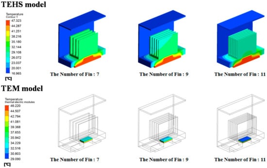 Numerical analysis results of temperature gradient of the TEHS with varying number of cooling fins.