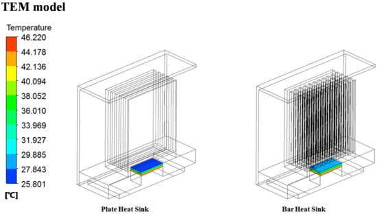 Numerical analysis results of temperature gradient of the thermoelectric module (TEM) with plate and bar type cooling fins.
