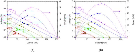 I–V characteristics of (a) 128A1030 (Peltron) and (b) TK-1-3-S (HTRD) TEMs for different temperature gradient.