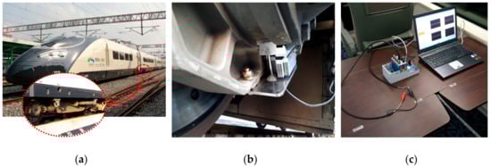 (a) HEMU-430X, Korean next generation high speed train, (b) TEHS mounted on axle bearing housing of HEMU-430X train, (c) On board data measurement setup.
