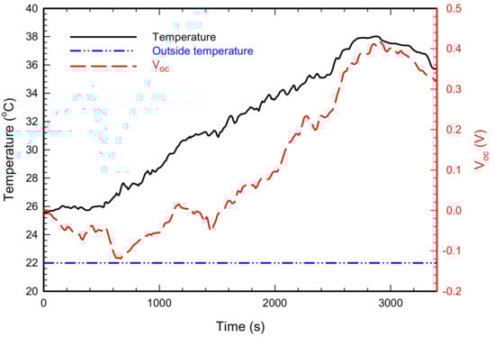 An open circuit voltage measured at the section between Osong and Dongdaegu is shown in Figure 11 together with the results of housing surface temperature and outdoor temperature. According to the conditions of railroad vehicle operation, the output voltage between the start of driving and approximately 1500 s (approximately 26 min) is unstable. That is because the initial driving speed is low, and the temperature of the axle bearing housing slowly increases, so stabilized power generation by TEM takes time. Actually, the surface temperature of the axle bearing housing increases after 800 s (approximately 13 min), and the maximum surface temperature reaches 38 °C at 2900 s without a temperature decrease. The open circuit voltage rapidly increases after 1600 s, and its maximum voltage is 0.4 V. As with the change in temperature, the output voltage also decreases after 2900 s when the railroad vehicle starts to decelerate to stop in Osong.