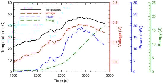Based on the result of the field test, the estimated performance of the TEHS as a power source is presented in Figure 12. To harvest maximum power from the waste heat, it is important to select the optimal load resistance [37]. The result of the performance test on the TEM in Section 3 suggests that the optimal load resistance varies according to temperature conditions. Note, however, that configuring self-adjusting load resistance in accordance with temperature requires an additional power management circuit, and it may consume unnecessary electric power. Thus, the results in Figure 12 are obtained assuming constant optimal load resistance connected to the TEHS. The average temperature of the housing surface measured by the field test is approximately 36.8 °C, and the average temperature difference on both sides of the TEM is 14.8 °C. Therefore, accepting the result presented in Table 2b, the constant load resistance is assumed to be 1.9 Ω. Along with this condition, the output voltage, electric power, and charging energy with the assumed 100% charging efficiency of the TEHS are as shown in Figure 12. The TEHS has a maximum output voltage of approximately 0.192 V, its maximum power is approximately 19.3 mW, and its charged electric energy after railroad vehicle operation for 3400 s is approximately 16.6 J. Commercial low power sensors usually use 1.8 V or 3.3 V constant voltage source as a power supply. Therefore, the power management circuit is required to regulate power from the TEM, store electrical energy, and finally make constant voltage output. Assuming an electric energy conversion efficiency of 70%, which explains the energy loss of power management, approximately 11.6 J of electric energy can be stored for 3400 s. This amount of energy may continuously operate 30 commercial low-power temperature sensors (1.8 V–30 μA, PCT2202UK, NXP semiconductors, Eindhoven, The Netherland) or continuously operate 2 low-power 3-axis acceleration sensors (3.3 V–0.4 mA, MMA8491Q, NXP semiconductors, Eindhoven, The Netherland) for 3400 s.