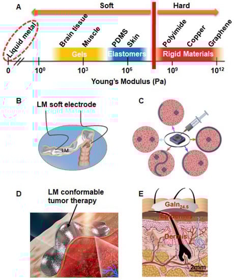 Various flexible and conformable LM bioelectrodes. (A) The comparison of Young’s modulus among liquid metal and common soft and rigid materials, reproduced with permission from [17]. (B) The conceptual illustration of LM soft electrode, reproduced with permission from [12]. (C) LM conformable electrode with five different shapes. (D) LM conformable tumor therapy, reproduced with permission from [35]. (E) Structural diagram of LM soft electrode on skin surface, reproduced with permission from [36].