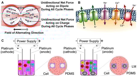 (A) The effect of electrical field treatment on dividing cells reproduced with permission from [54]. (B) The ion channels of K+, Na+, Ca2+ and electrogenic transporters in cardiac cells reproduced with permission from [57]. (C) LM electrode on tumor cell therapy in vitro under electricity reproduced with permission from [12].