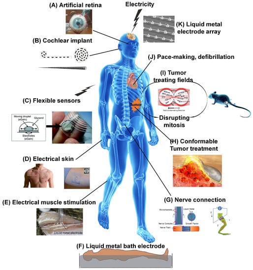 LM-enabled electrobiology in disease therapy. Human model (http://cn.bing.com/); (A) Artificial retina reproduced with permission from [69]; (B) Cochlear implant [70]; (C) Flexible sensors [65]; (D) Electrical skin reproduced with permission from [66,73]; (E) Electrical muscle stimulation reproduced with permission from [74]; (F) Liquid metal bath electrode reproduced with permission from [75]; (G) Nerve connection reproduced with permission from [65,76]; (H) Conformable tumor treatment; (I) Tumor treating fields reproduced with permission from [11,77]; (J) Pace-making and defibrillation; (K) Liquid metal electrode array reproduced with permission from [78].