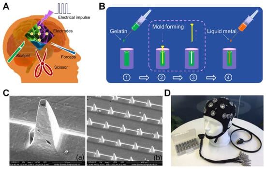 (A) Schematics for conventional surgery in implanting electrode for brain stimulator reproduced with permission from [59]; (B) The fabrication procedure of injectable metal electrodes reproduced with permission from [65]; (C) The SEM image of liquid metal electrode array reproduced with permission from [78]; (D) Brain electrode cap (http://cn.bing.com/).