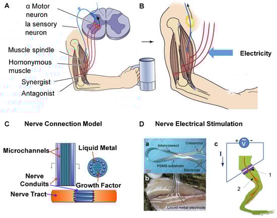 Nerve connection and implanted electrical stimulation. (A,B) respectively show excitation from central neuron and electricity stimulation to muscle (from NEUROSCIENCE, Fourth Edition, Figure 16.10). (C) Nerve connection model with liquid metal microchannels to repair the injured peripheral nerve reproduced with permission from [76]; (D) Implanted nerve electrical stimulation based on LM; (a) The optical image of LM electrode array reproduced with permission from [74]; (b) The implanted LM electrodes for the bullfrog sural nerve and tibial nerve reproduced with permission from [74]; (c) Schematic of nerve electrical stimulations based on the injectable LM electrode reproduced with permission from [65].