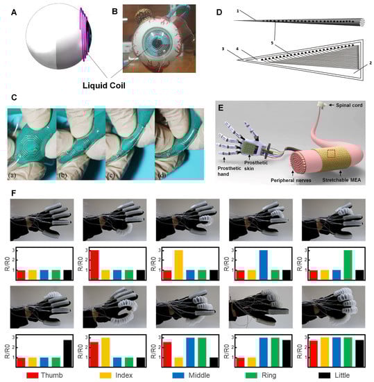 Amit et al. realized a soft coil based on LM and demonstrated that this coil is an excellent alternative to stiff and uncomfortable coils for biomedical implants [69]. LM was injected into elastomeric microfluidic channels to produce LM-based coils, which can deliver power to the implant coil efficiently in a telemetry system. Meanwhile, Zhao et al. designed an innovative LM electronic coil for eye movement tracking (Figure 6A,B) [69]. Experiments show that the results measured by LM coil correlate well with those of classical copper coil during eye movement. Meanwhile, Figure 6C has fully showcased the excellent flexibility of LM coil. Coupled with its flexibility, these coils show great advantages in an implantable system, such as a retinal prosthesis system, whose secondary coil size is strictly limited by the anatomy of eye. Based on these studies, LM-based coils may hopefully be applied to wireless battery chargers, cardiac implants, and glucose-monitoring implants.