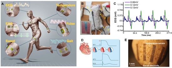 (A) The intelligent electronic skin network based on LM e-skin and wearable bioelectronics [110]. (B) Illustration for conducting an electrical stimulation to the experimental mouse reproduced with permission from [65]. (C) The recorded ECG signals of experimental mouse undergoing a 10 Hz electrical stimulation with magnitude of 0.6 mV, 1.2 mV and 1.3 mV, respectively reproduced with permission from [65]. (D) The formation of ECG signals; negatively polarized (resting) muscle is shown as blue; depolarized muscle is red; Action potentials recorded at sites 1 and 2 are similar in timing and morphology reproduced with permission from [57]. (E) Image of a representative device integrated on a Langendorff-perfused rabbit heart. The white arrows highlight functional components reproduced with permission from [109].