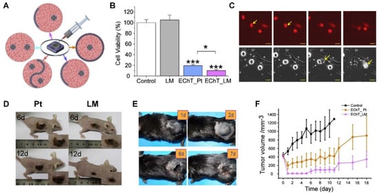 Electrostimulation in tumor treatment. (A) Five therapeutic method configurations of LM electrode in different shapes reproduced with permission from [12]; (B) Cell viability of LM, EchT_Pt, EchT_LM reproduced with permission from [12]; (C) The microscopic evidence of HeLa cells membrane blebbing with TTFields treatment during mitosis reproduced with permission from [114]; (D) The 6th and 12th days treatments of melanin tumor-bearing mice by Pt electrode and LM electrode treating reproduced with permission from [12]; (E) Electrical stimulation treatment of malignant melanoma tumor on C57BL/6 mice based on LM spray-printing reproduced with permission from [77]; (F) Tumor volume of different groups of tumor-bearing mice reproduced with permission from [12].