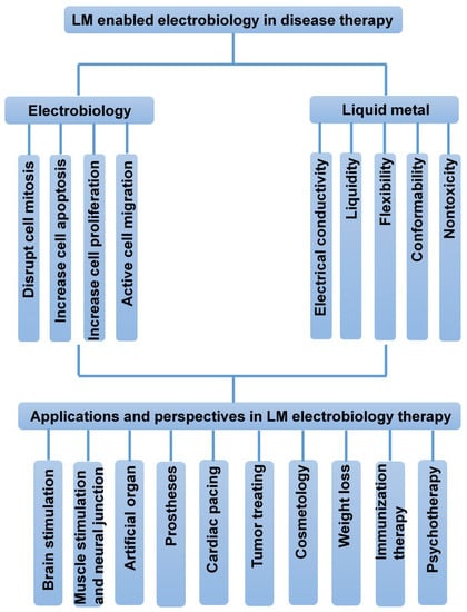In summary, the basic concept of LM electrobiology is proposed and a generalized disease therapy framework is established for coming studies and clinical clarifications. Due to its remarkable material features, such as metallicity, reliable flexibility, excellent electrical conductivity, and non-toxicity, LM can not only adapt to body disease models to generate conformable electrical treatment, but also reduce the contact resistance to avoid more energy loss when performing the task. At this stage, several basic electrostimulation mechanisms in disease therapy have been investigated. One of them cures diseases by inducing cell proliferation, migration, and excitation, including electrical muscle stimulation, nerve connection, artificial organs, cardiac pacing etc. The others prevent the cell lines by disrupting cell mitosis or increasing cell apoptosis. Taking oncotherapy as an example, under a specific tumor-treating field for a period of time, the tumor diminishes along with cancer cells being killed. Overall, given specific design, typical applications of LM electrostimulation would provide satisfactory therapeutic efficacy, a conformable treatment area and biological availability. This may lead to evermore simple physical method for future clinics and health care.