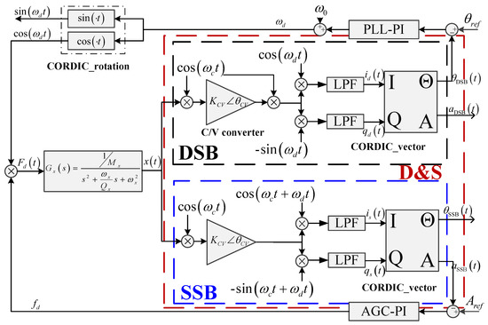 where id(t), qd(t) represent the orthogonal demodulation output signals using DSB configuration and is(t), qs(t) are the orthogonal outputs using SSB configuration. Then the orthogonal output signal is processed by a CORDIC vector module to gain vibration amplitude and phase information, which are expressed by Equations (5) and (6) respectively. Amplitude and phase information using DSB configuration are represented by Ad(t) and θd(t), respectively. Similarly, As(t) and θs(t) are the derived results using SSB configuration.