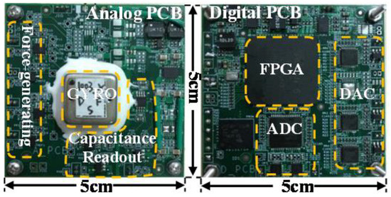 To compare test results of the gyroscope using D&S with that only using the DSB or SSB method, some comparative experiments are conducted using a field programmable gate array (FPGA) based digital platform on a vibratory micro-machined gyroscope, as shown in Figure 3. The analog interface circuit mainly consists of the MEMS gyroscope, the force-generating module and the capacitance-voltage module, while the digital circuit mainly comprises an FPGA device, analog-to-digital (A/D) converters and digital-to-analog (D/A) converters.