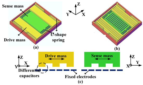 The structure of the gyroscope is similar to that reported in [12], and shown in Figure 4. It is a capacitive gyroscope with an outer frame serving as drive mass and inner frame serving as sense mass. The drive mode (outer frame moving in the X direction) and the sense mode (inner frame moving in the Y direction) can be modeled using a lumped second order spring-damper-mass system. The drive mode is driven into resonation using electrostatic force which can be seen as a resonator. As illustrated in Figure 4c, we use a differential capacitor and push pull voltage pair to drive the gyroscope laterally. As the capacitance varies linearly with displacement in our gyroscope unlike parallel plate capacitors, the net force in the lateral direction is linear.